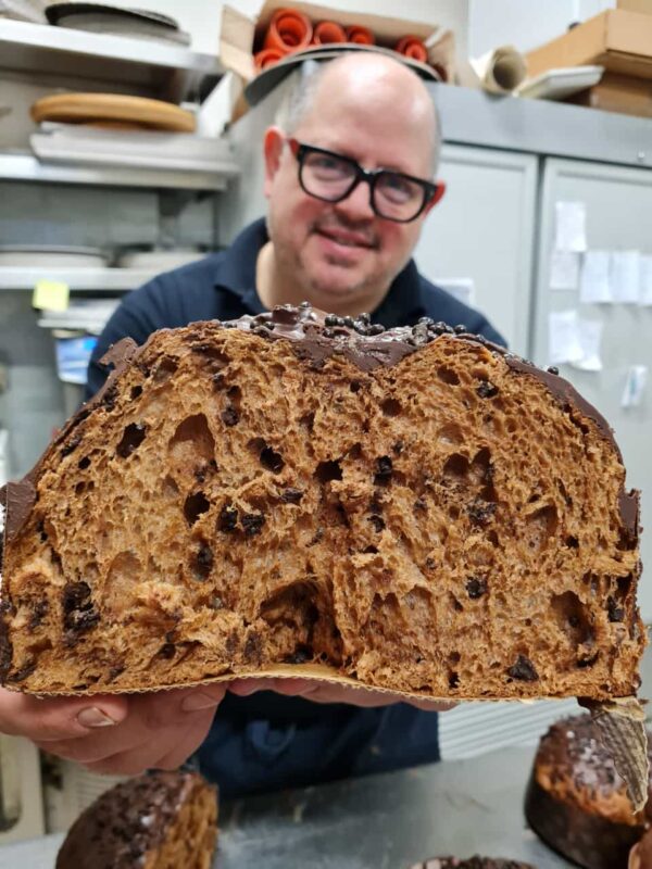 - panettone “MBriaco”, con pere semicandite, cioccolato fondente e iniezione post-cottura di rhum barricato e bacche di vaniglia