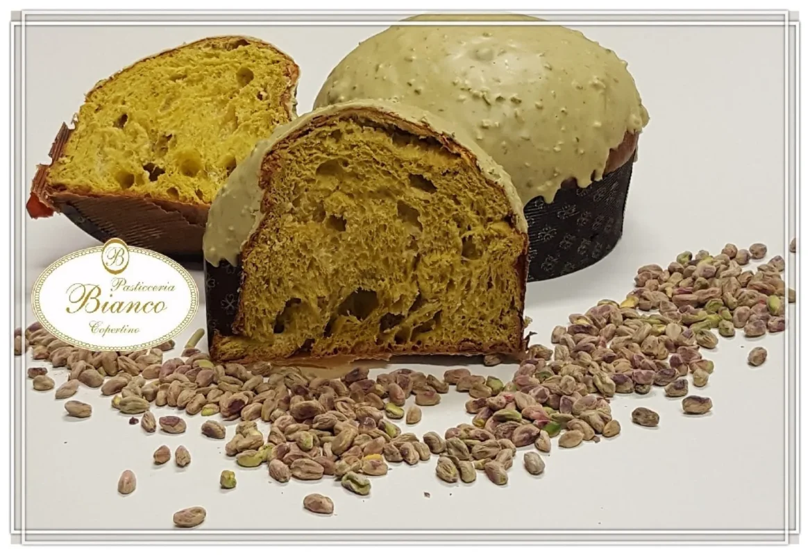 - panettone al pistacchio con lenti di cioccolato bianco e cuore di cremino