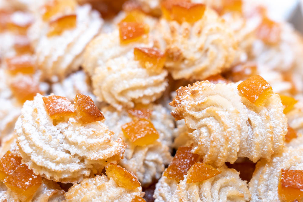 - Roselline con frutta: dolcetti eleganti e raffinati, arricchiti dalla presenza di frutta candita che dona una nota di freschezza e vivacità al sapore avvolgente della mandorla.